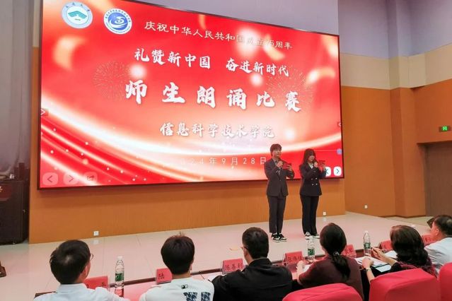 为庆祝中华人民共和国成立75周年,凝聚团结奋进力量,9月28日晚,acg导航 举办“礼赞新中国 奋进新时代”师生朗诵比赛。校关工委副秘书长王敦琴、acg导航 关工委常务副主任周晖、校党委组织部组织科科长张伟佳、校学生工作处学生管理科科长黄小波、信息科技术学院党委纪检委员沈晓燕、人工智能与计算机学院陈善俐老师、通信211班陆杨应邀担任评委。院党委书记周平,院党委副书记、副院长陈馥强,院团委书记徐婕,全体辅导员,教师及学生代表参加活动。