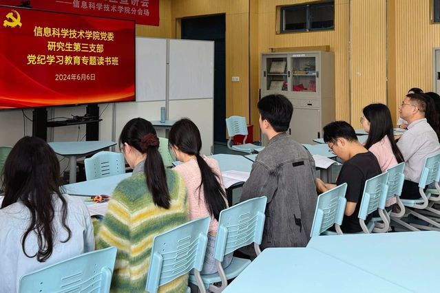 研究生第三党支部开展党纪学习教育专题读书班集中学习,支部书记陈建新教授再次强调了开展党纪学习教育的重要意义,希望研究生都能提高政治站位、增强纪律意识、提高党性修养、强化责任担当;通过原原本本学,深刻领悟,抓住学习重点,注重学用结合,真正做到党纪学习教育走深走实。