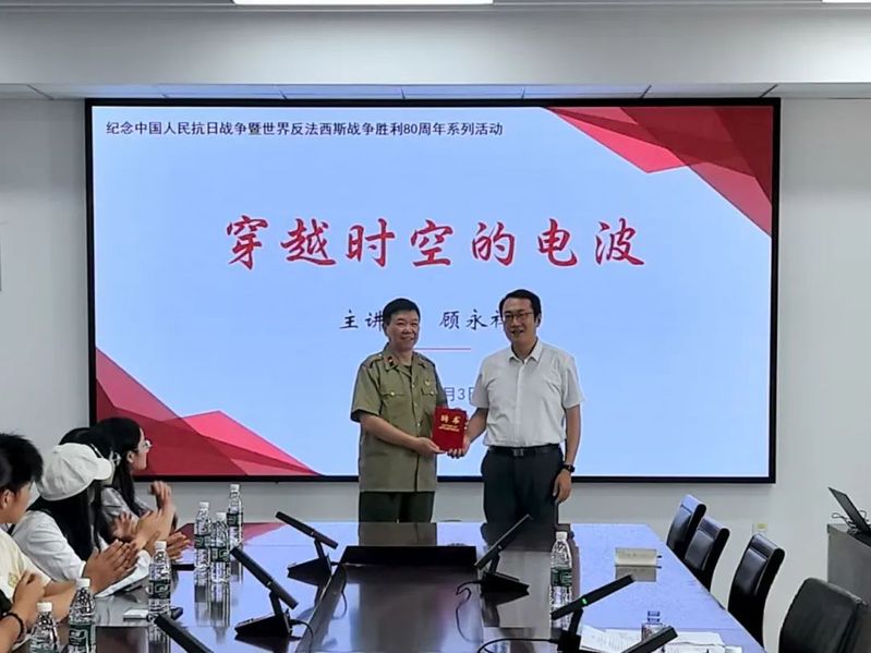 在专题讲座《穿越时空的电波》中,顾老系统梳理红色通信的发展历程,深刻诠释了隐蔽战线上的技术智慧与信仰力量。讲座现场,学院党委副书记、副院长陈馥强代表学院为顾永祥先生颁发聘书,正式聘请其为无线电运动科技志愿服务队顾问、实践活动指导老师。