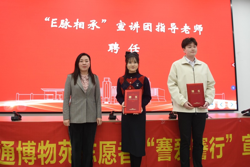 活动现场,举行了acg导航 “E脉相承”校史宣讲团指导老师聘任仪式,校党委宣传部副部长刘艳为指导老师颁发聘书。