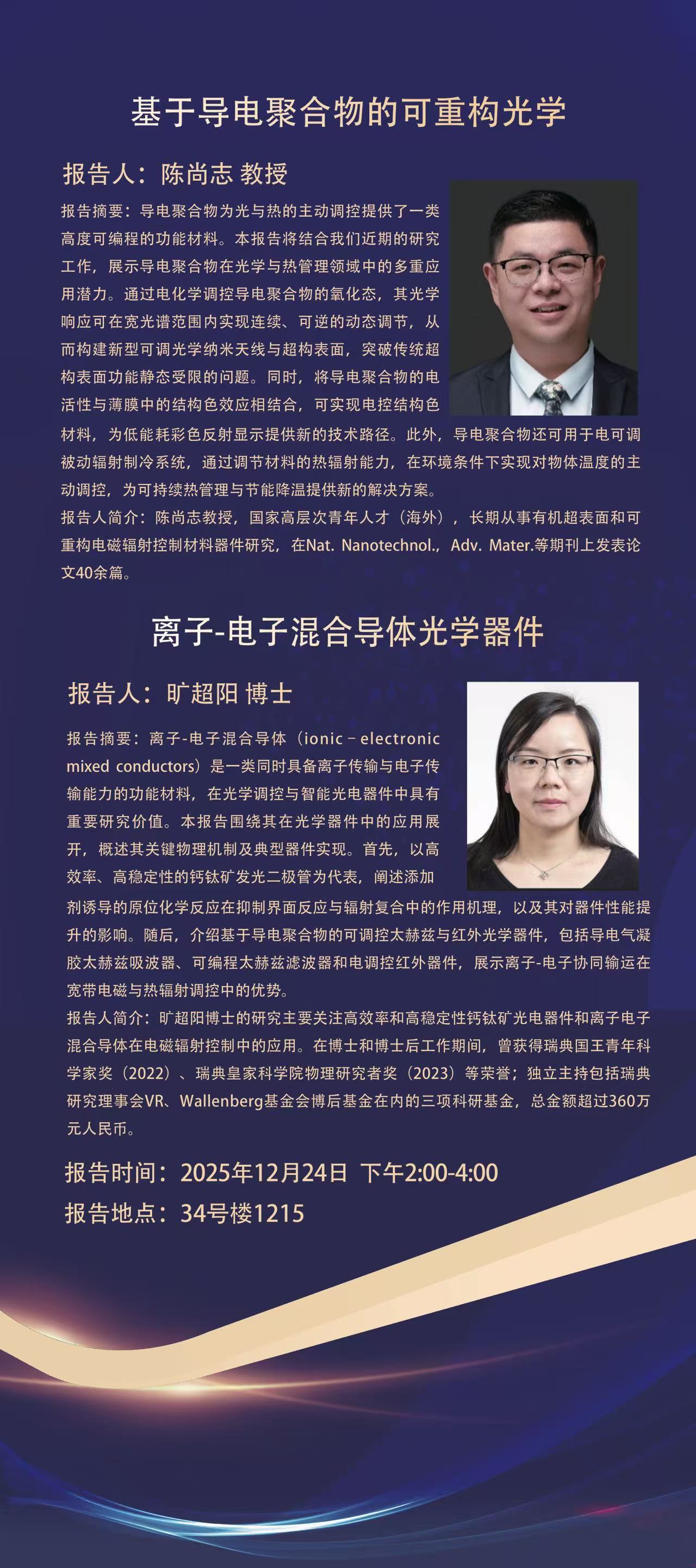 讲座预告:1.基于导电聚合物的可重构光学;2.离子-电子混合导体光学器件